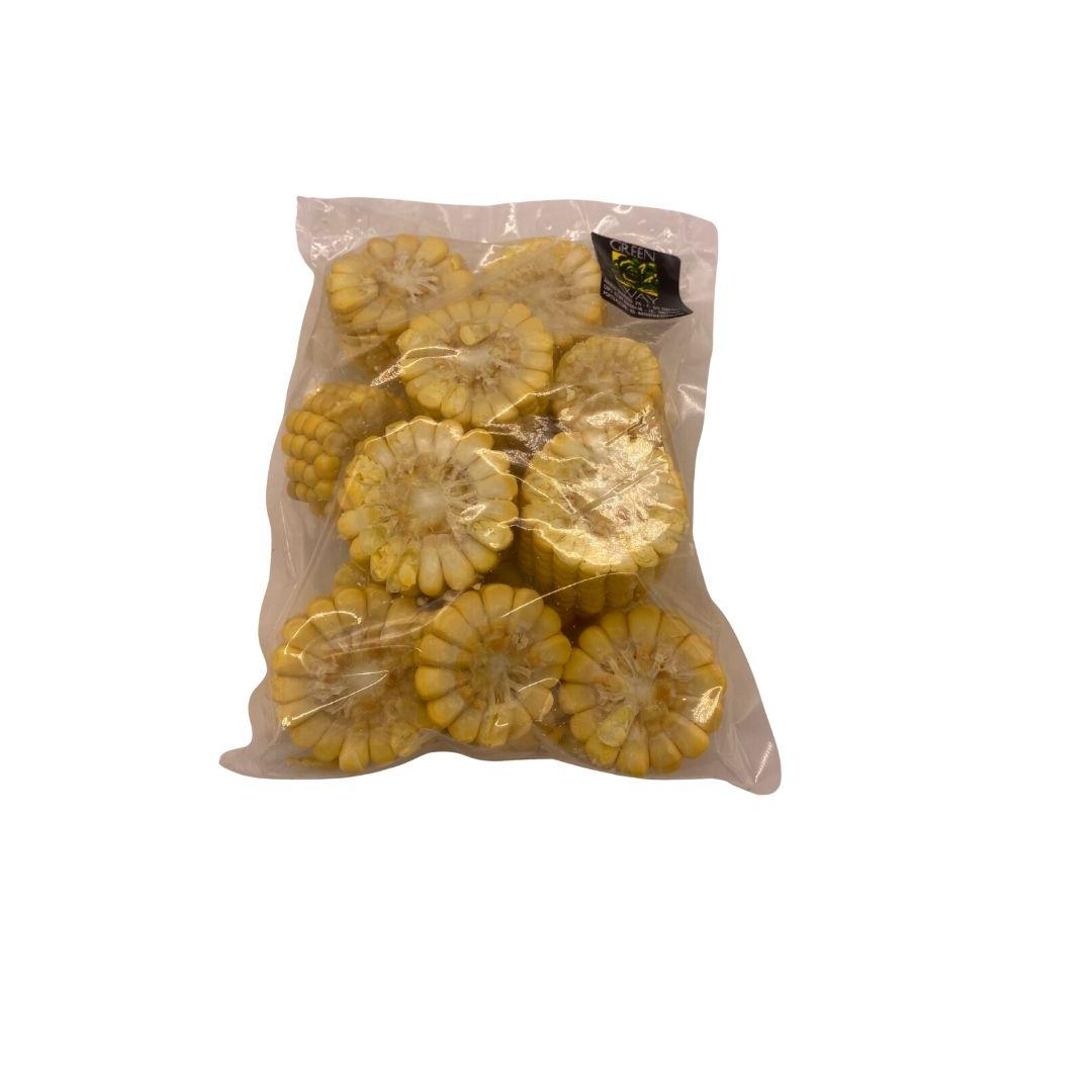 Milho Verde cortado em rodelas, descascado, higienizado e retirado o "cabelo" do milho da parte superior.